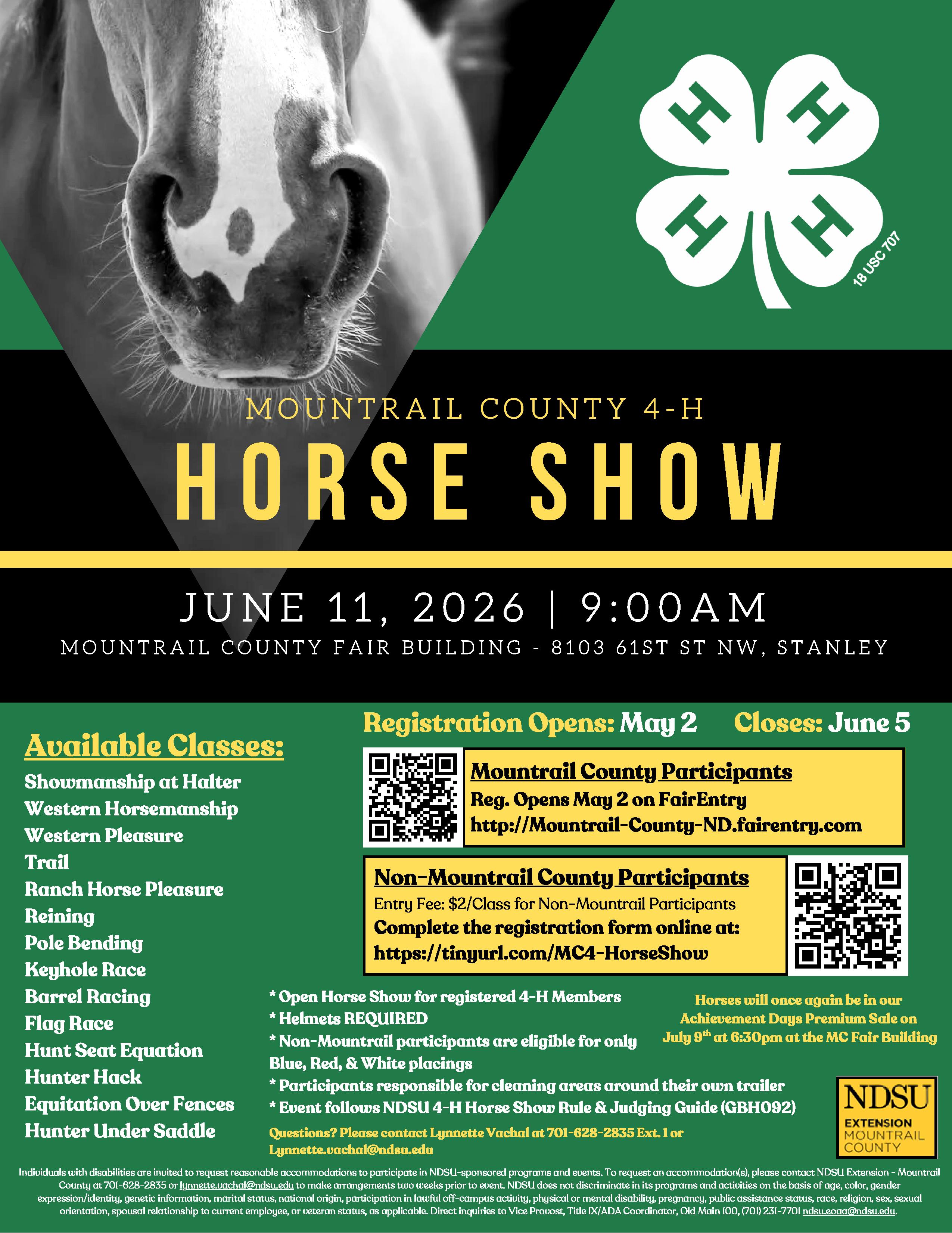Additional Horse Show policies for Mountrail County 4-H Members can be found in our policy book located @ https://tinyurl.com/MC4-HPolicyBook